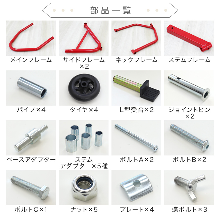 タイヤ脱着やエンジン回り・チェーン等のメンテナンスに使います。