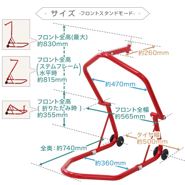 ※フロント用で使用する場合は、フロントのみの使用の場合は倒れる事がありますので、必ずリアのスタンドと一緒にご利用ください。