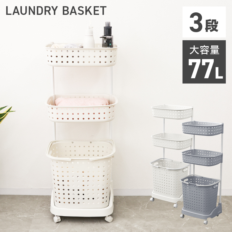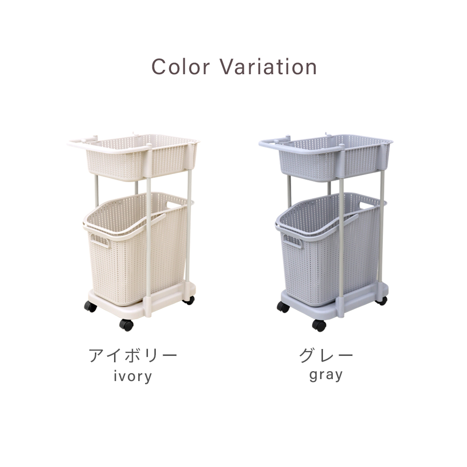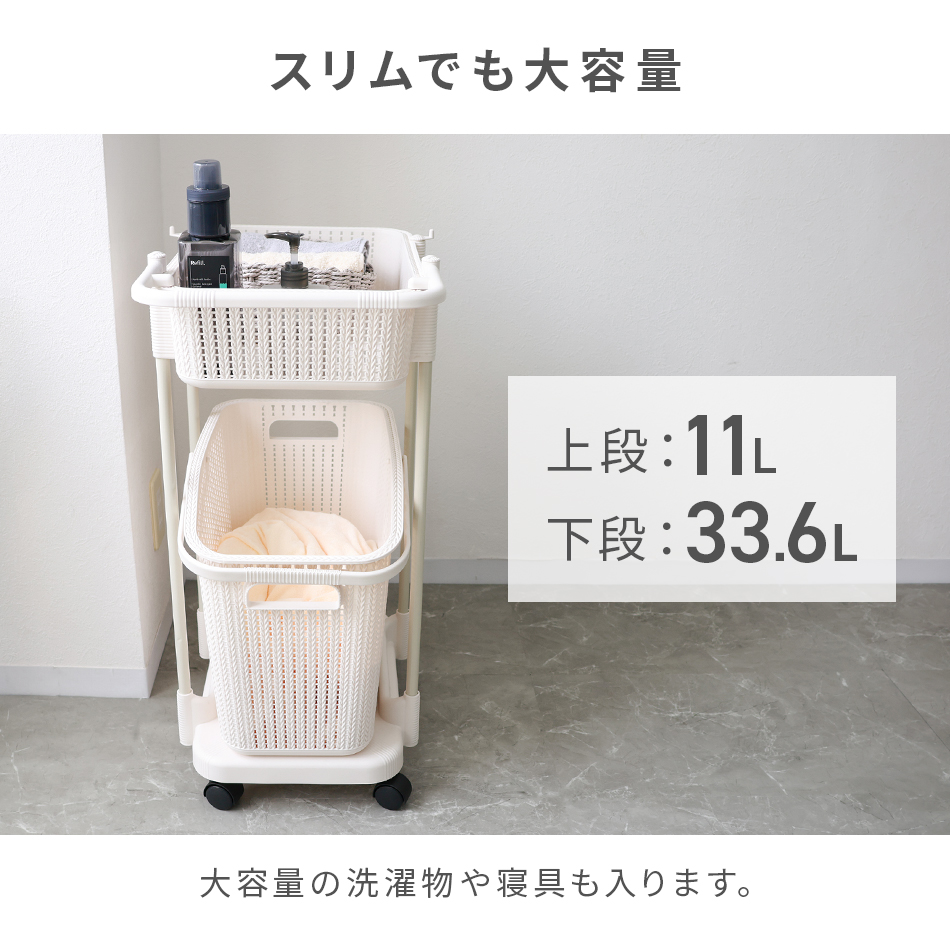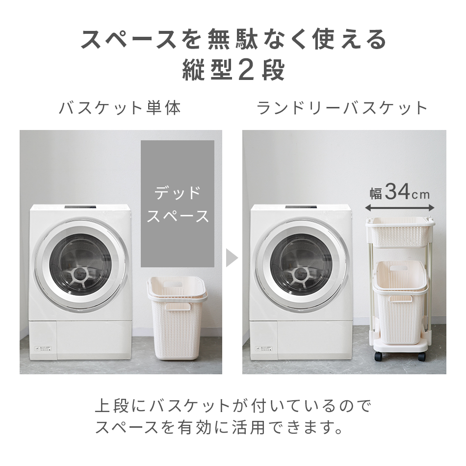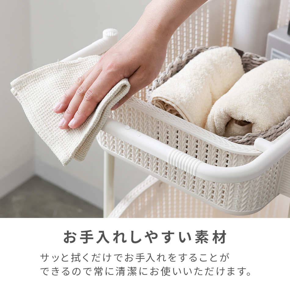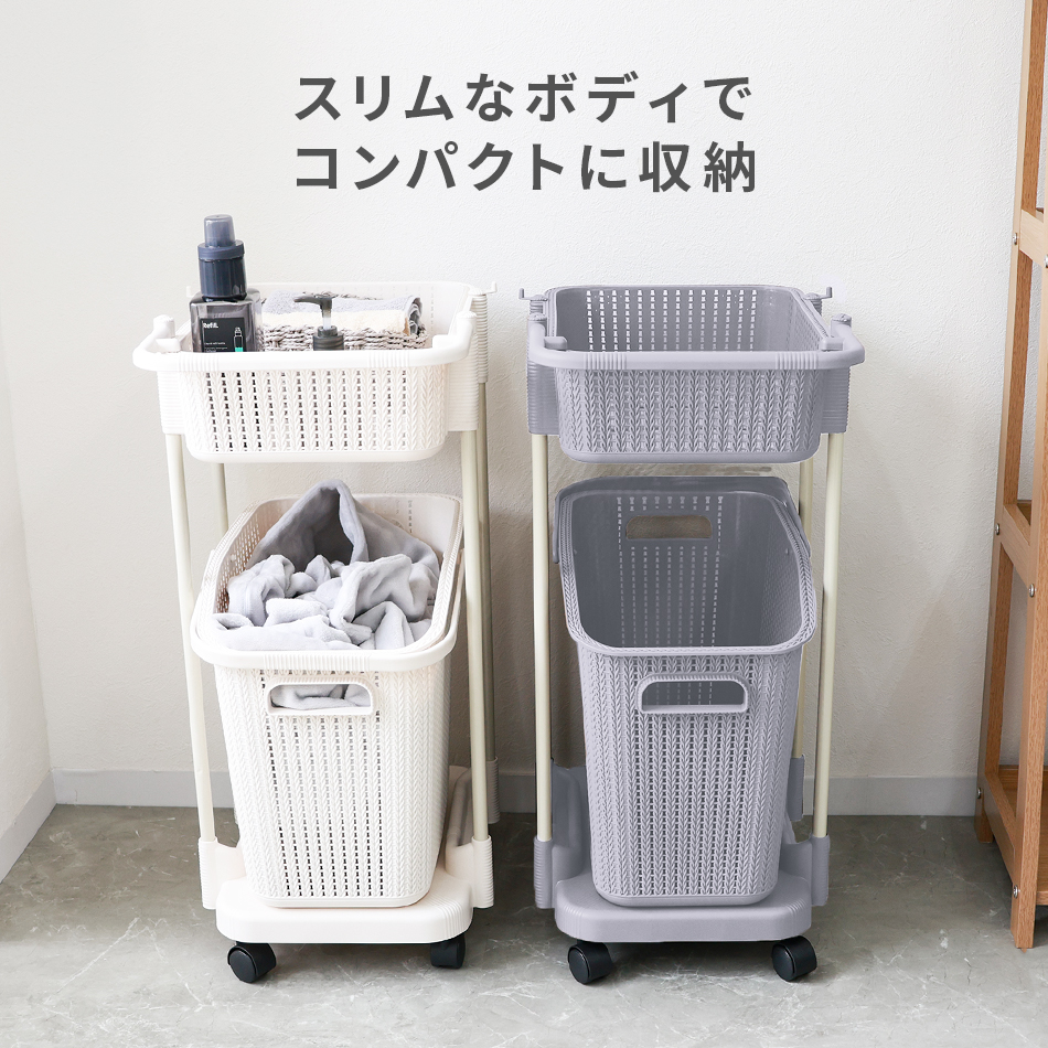 上段の浅バスケットにはバス用品、洗濯機まわりの小物が収納できます。