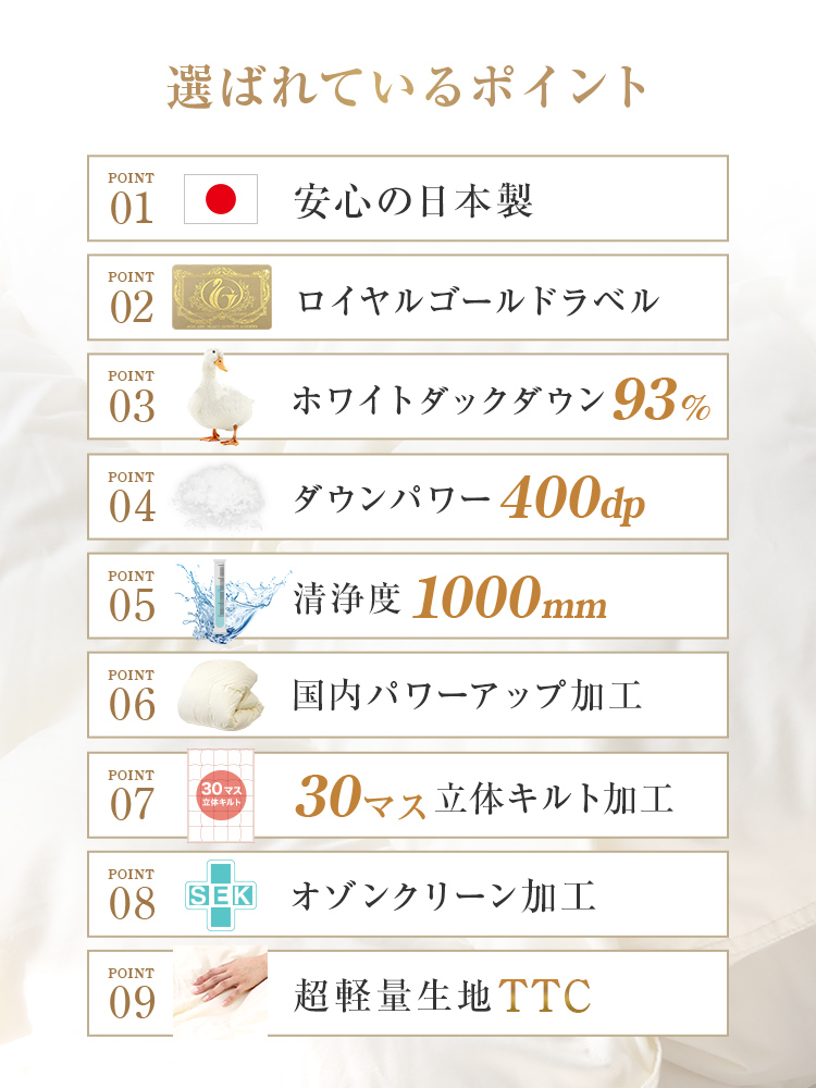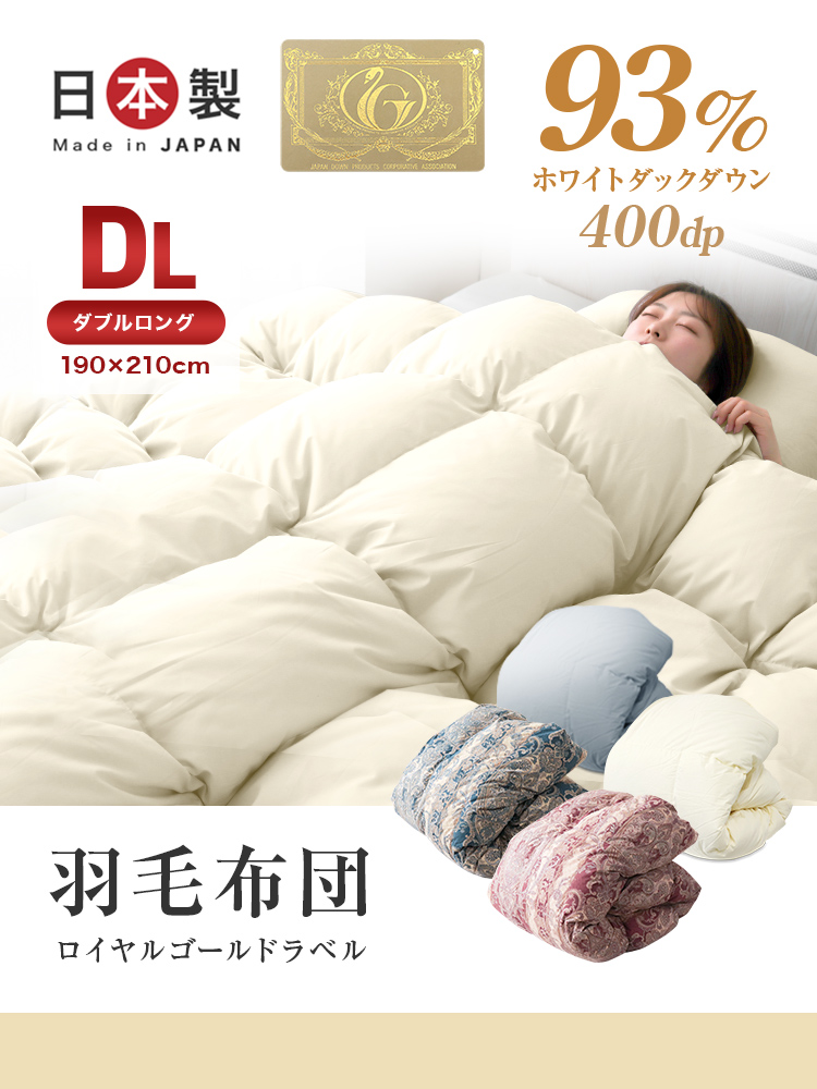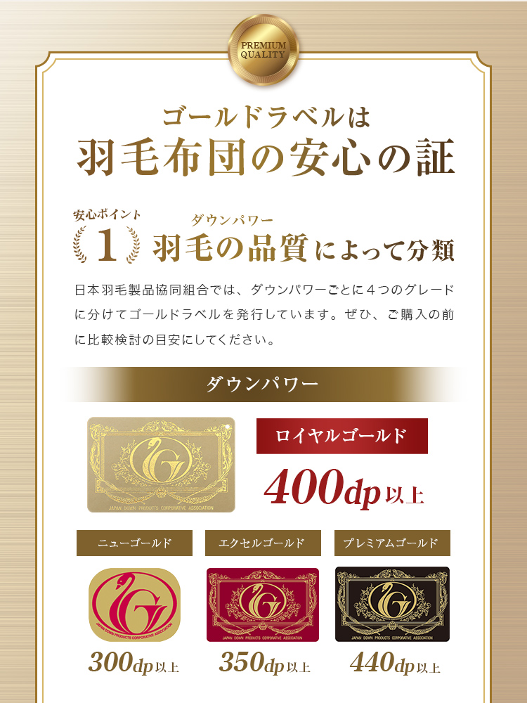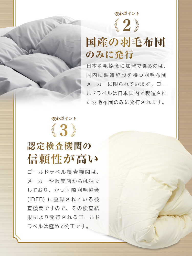 日本羽毛製品協同組合より「ロイヤルゴールドラベル」の認定を得た高品質・日本製の安心安全な羽毛布団です。