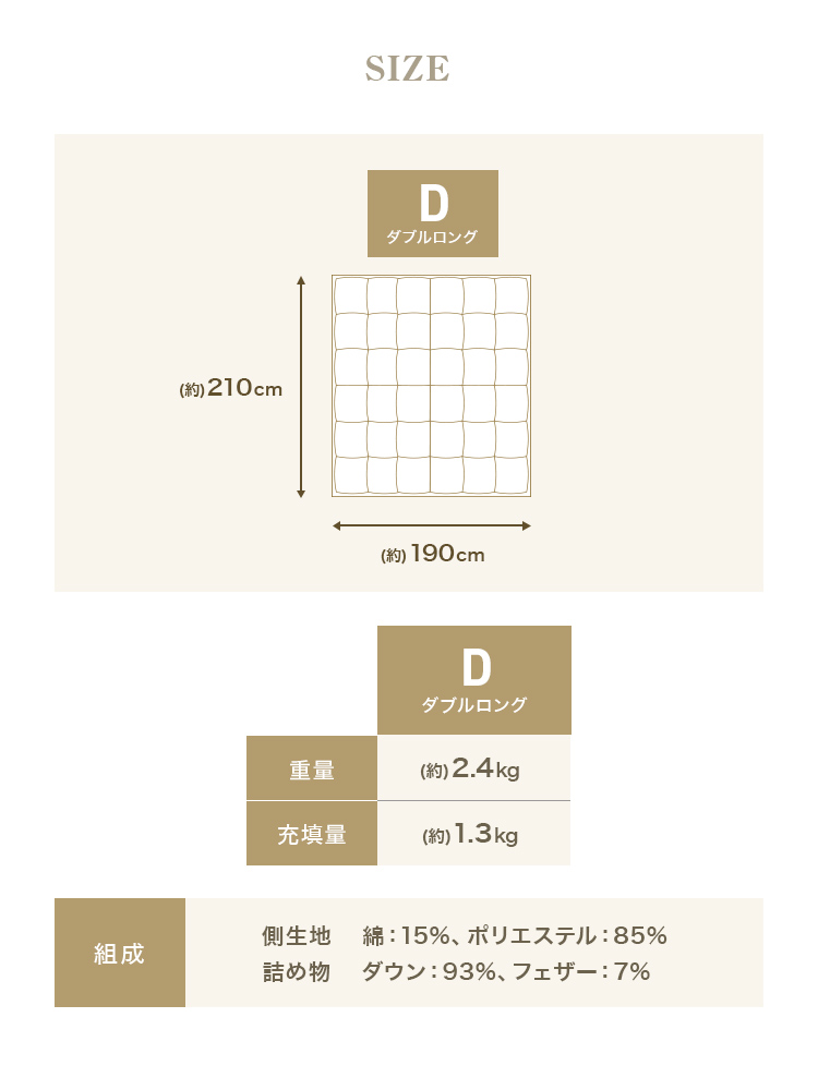 詰め物:ホワイトダックダウン(ダウン93%、フェザー7%)