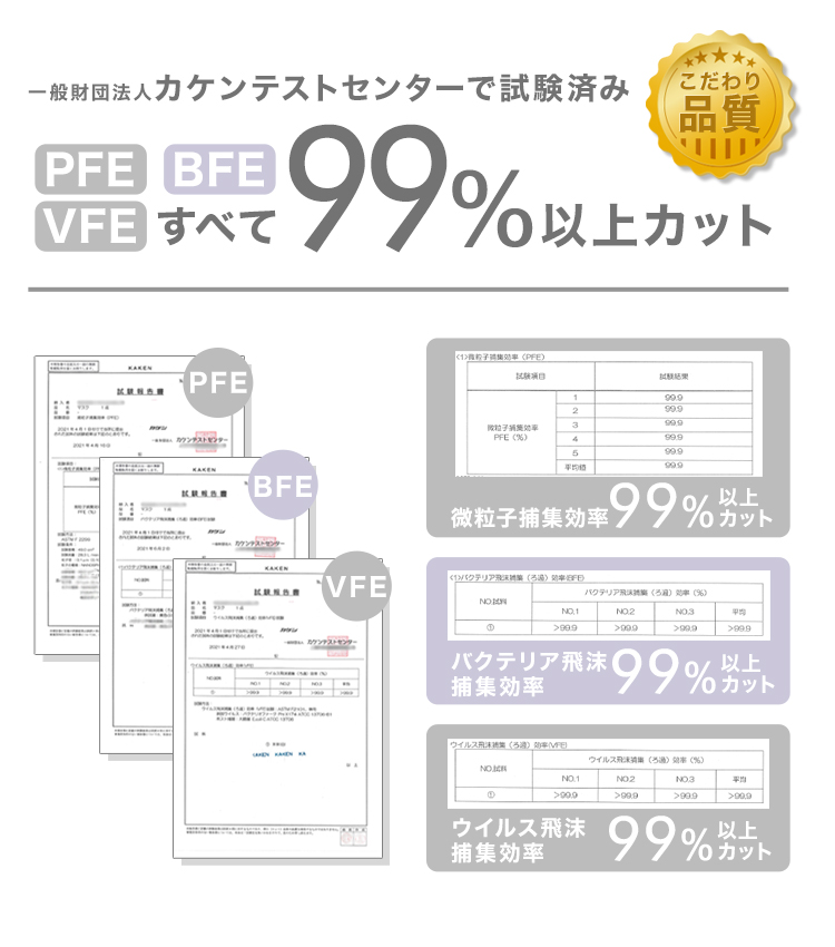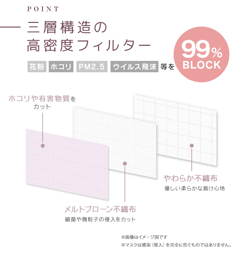 3層構造の高密度フィルターが花粉、ホコリ、PM2.5、ウイルス飛沫等を99% Block!