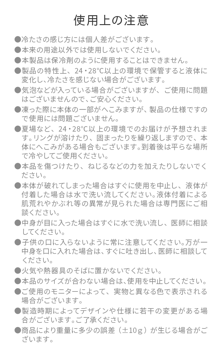 ・製品の特性上、28℃以上の環境で保管すると液体に変化し、冷たさを感じない場合がございます。