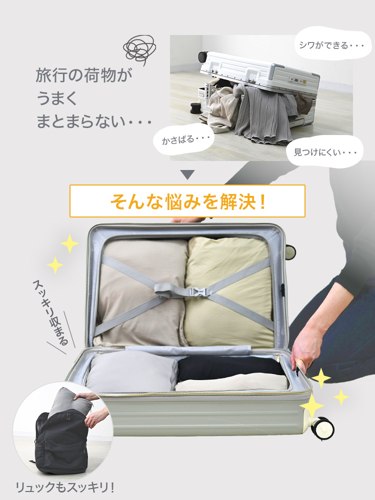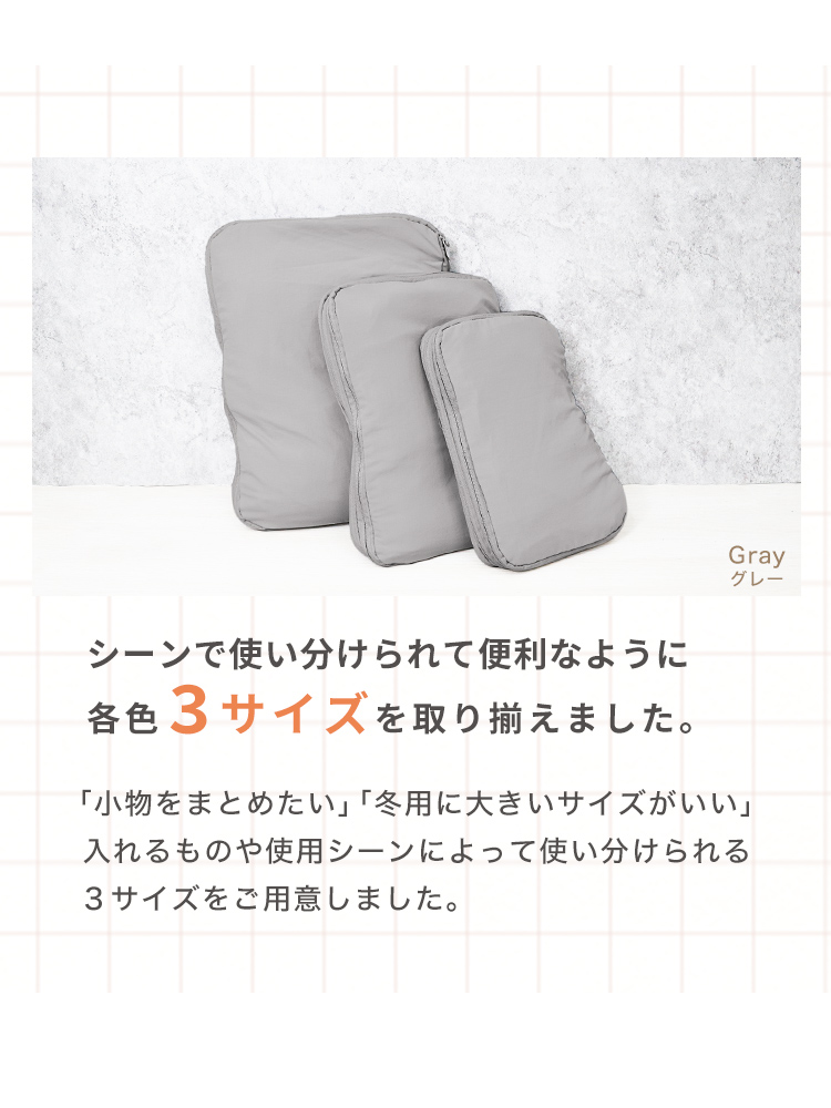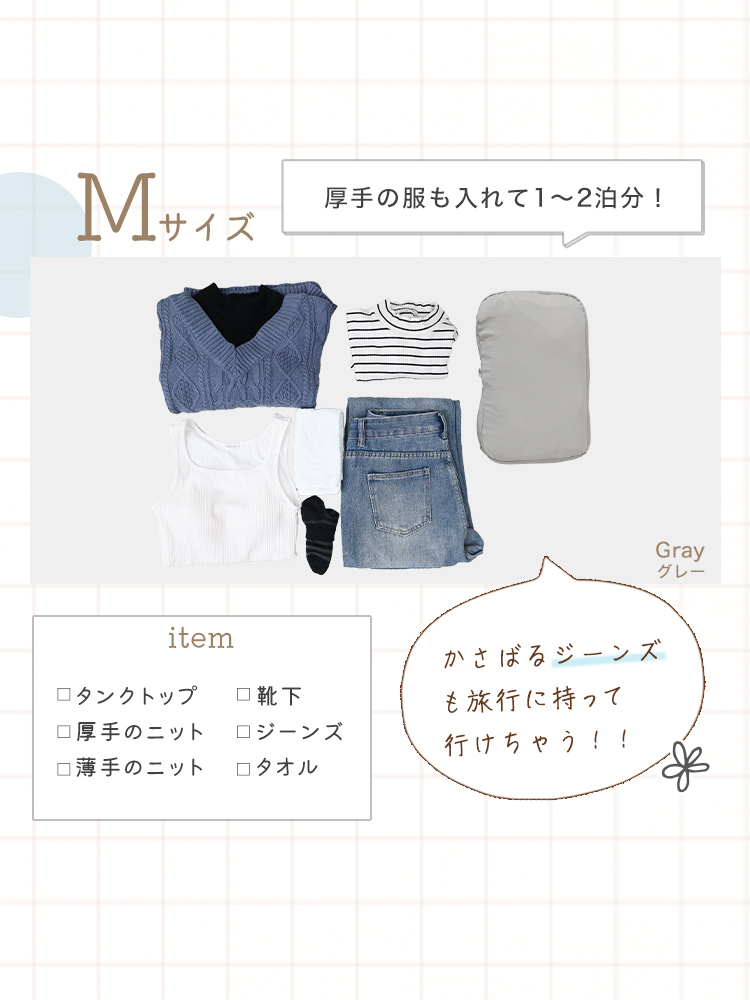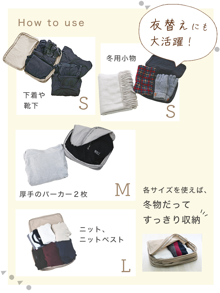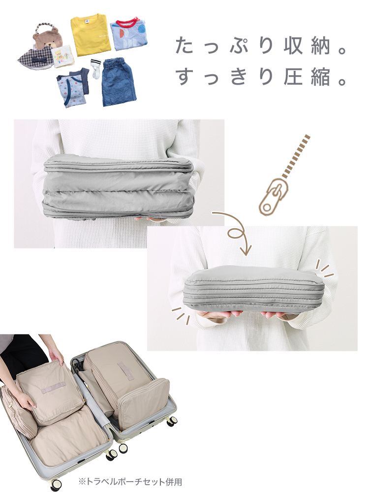 圧縮ポーチでかさばる衣類をコンパクトに収納できます。
