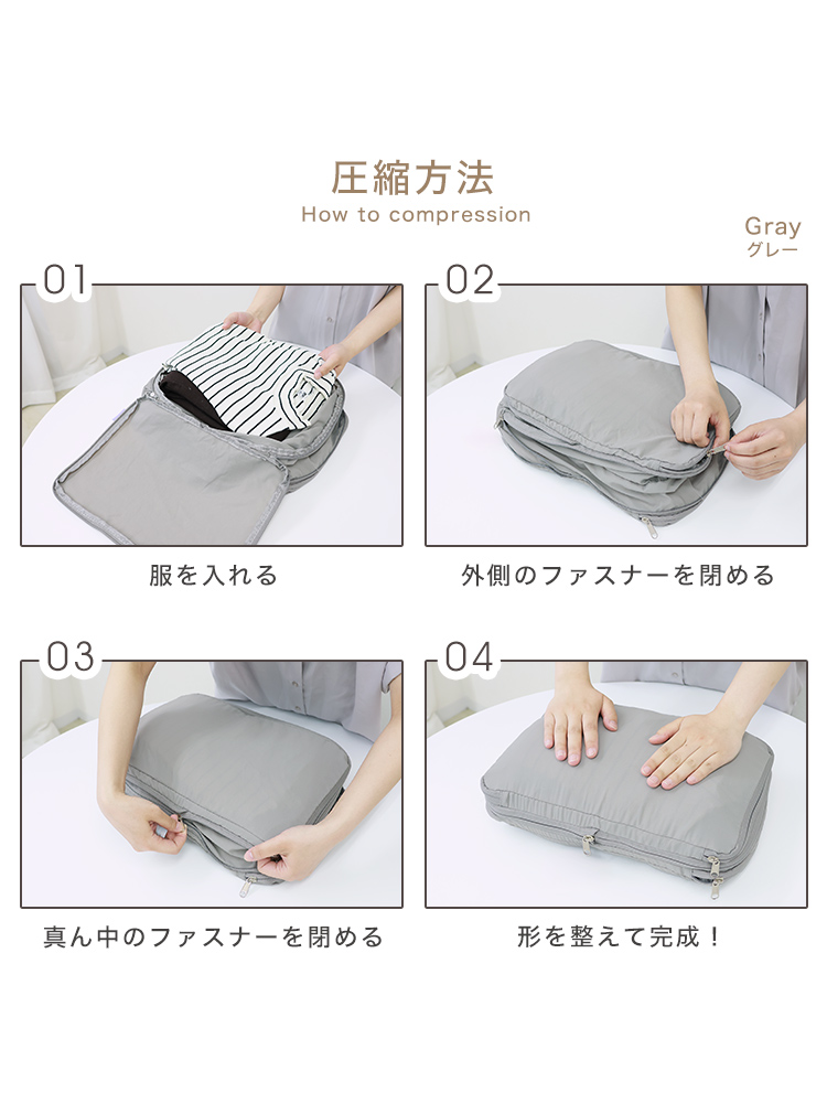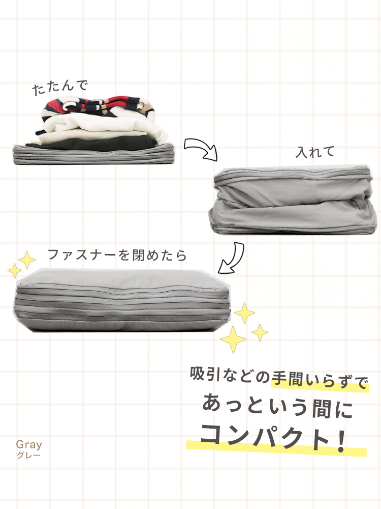 畳んだ衣類を収納して、ファスナーを閉めるだけで圧縮できます。
