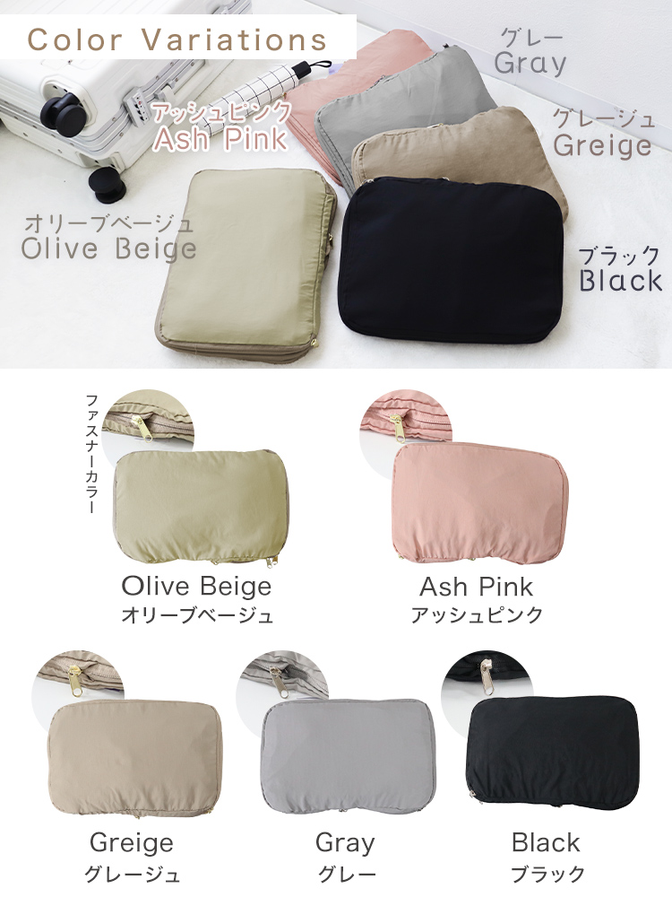 オリーブベージュ、ブラック、アッシュピンク、グレージュ、グレー