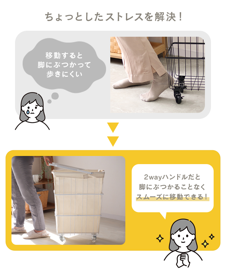 よくあるカゴを引っ張る際に脚にぶつかってしまう、ストレスを解決します!