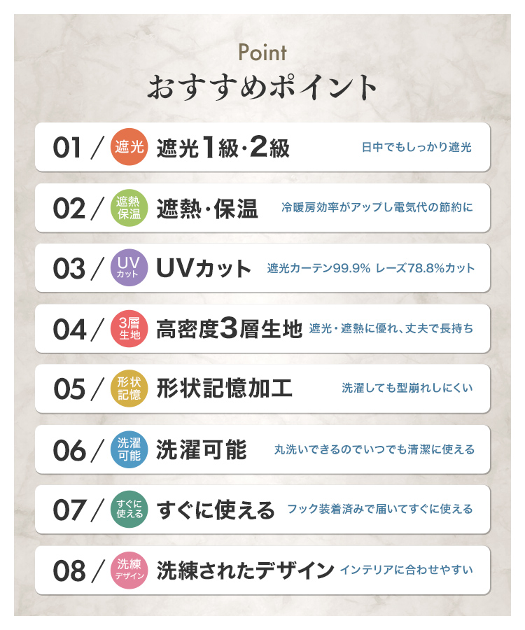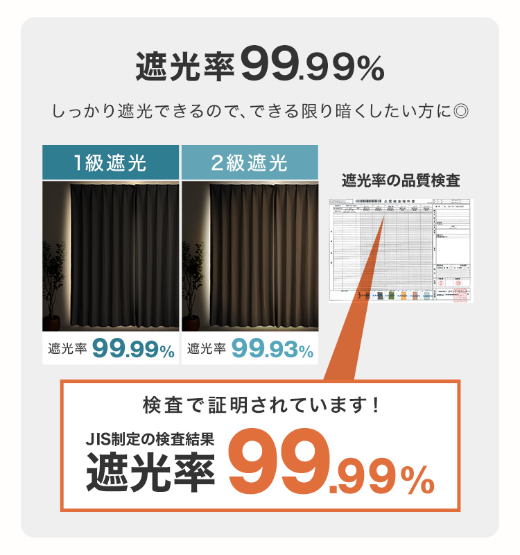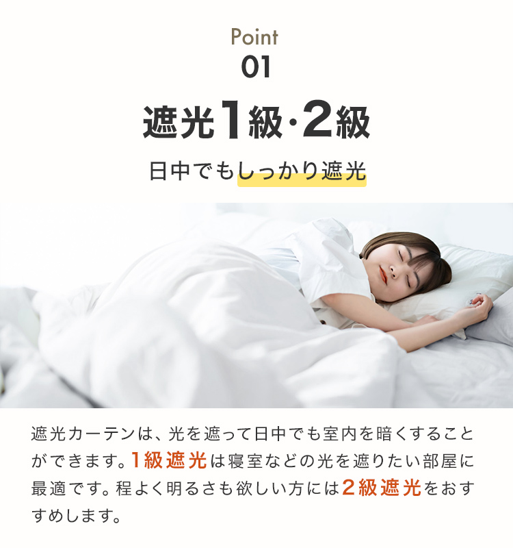 1級遮光:遮光率99.9%光を気にせずぐっすり眠りたい方にオススメ!