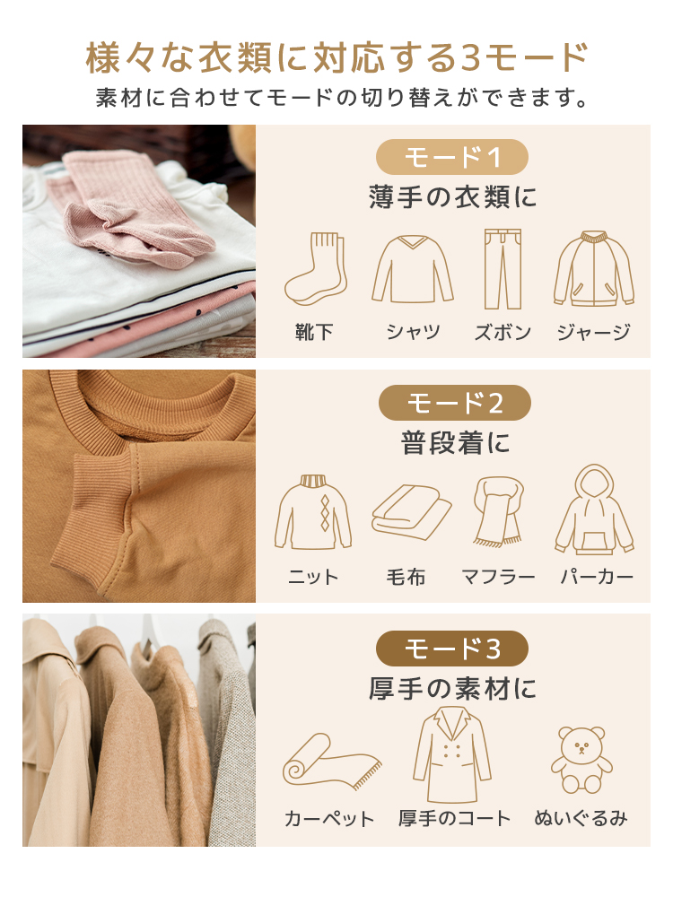 ニットから厚手の衣類まで生地に合わせて選べる3モード。