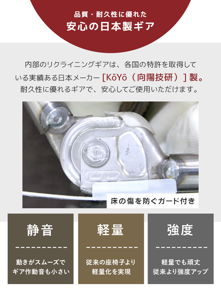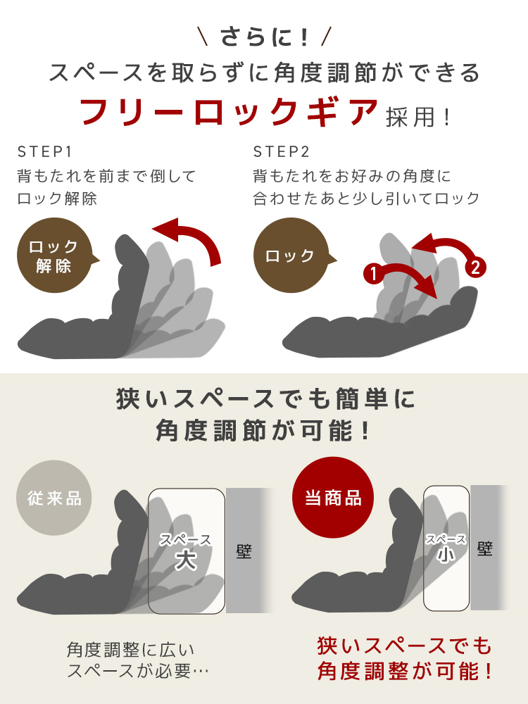 背もたれには日本製42段階リクライニングギアを搭載し、読書・テレビ鑑賞・昼寝・在宅ワークなどに合わせて細やかな角度調整が可能。