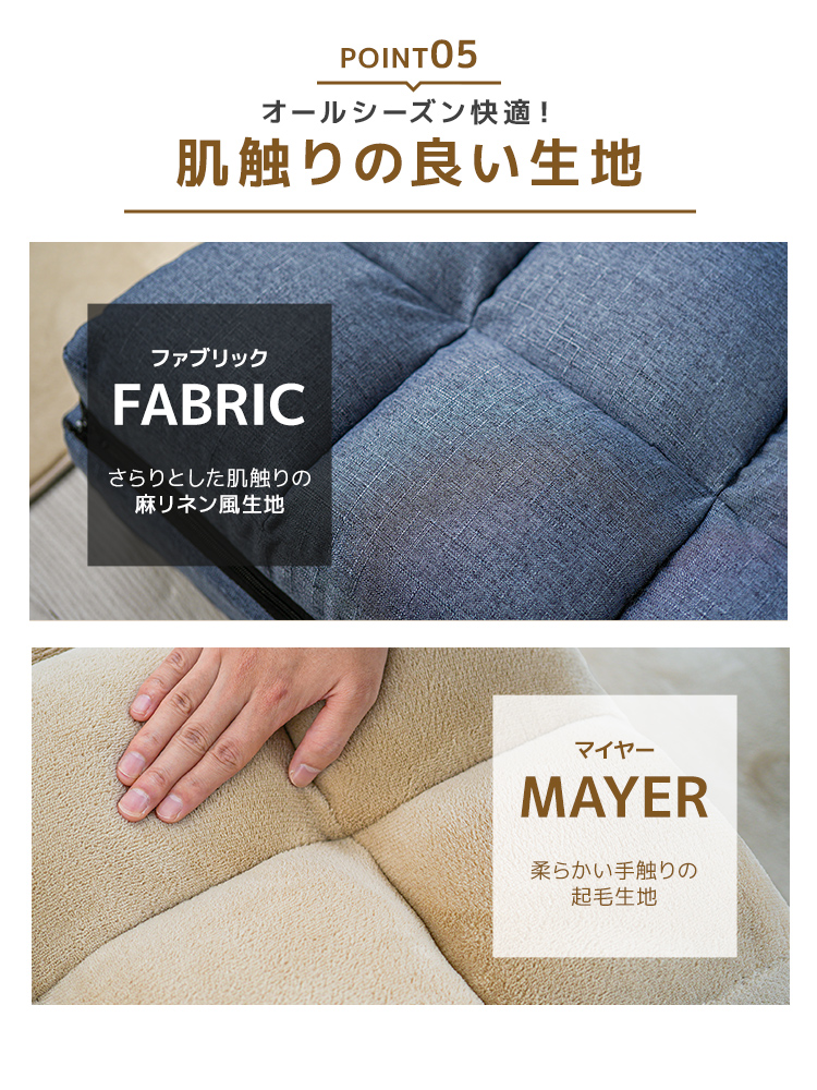 張地はポリエステル100%のファブリック生地とマイヤー生地でさらりとした手触りを実現し、季節を問わず快適に使用可能。