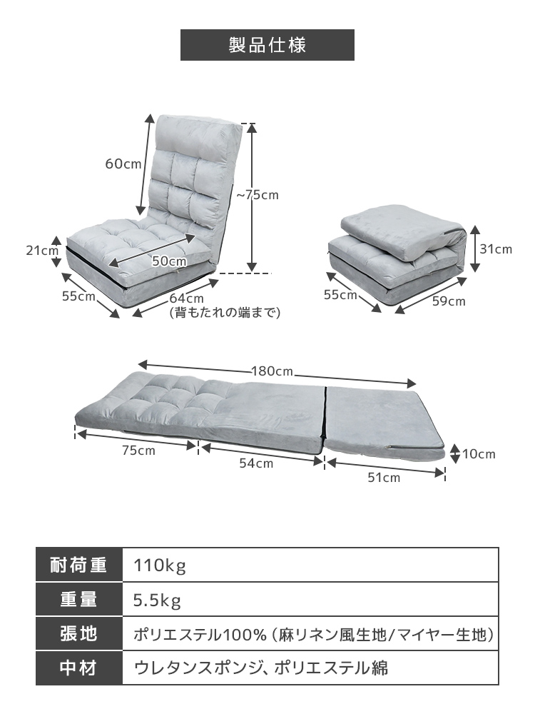 スタイルは4通りに変化し、座面クッションは分離可能でお手入れや収納にも便利。