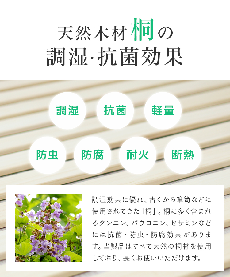 天然木「桐」を使用し、軽量なのに耐荷重100〜150kgの安心設計。