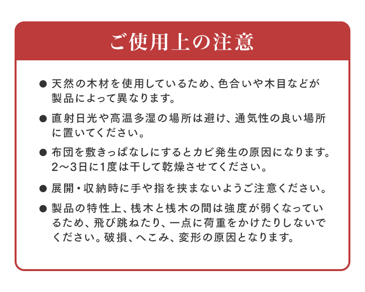 ・すのこの上に立つ場合はさん木の上に足をかけるなど強度の弱い部分に体重がかからないようにご注意ください。