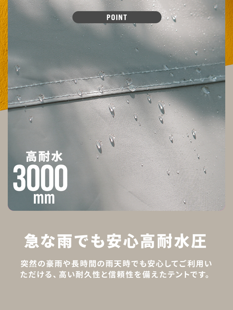 ・テント生地には撥水加工が施されていますが、雨天・豪雨下での完全防水を保証するものではございません。