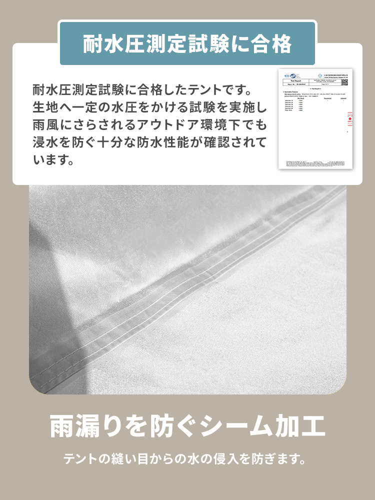 ・テント生地には撥水加工が施されていますが、雨天・豪雨下での完全防水を保証するものではございません。